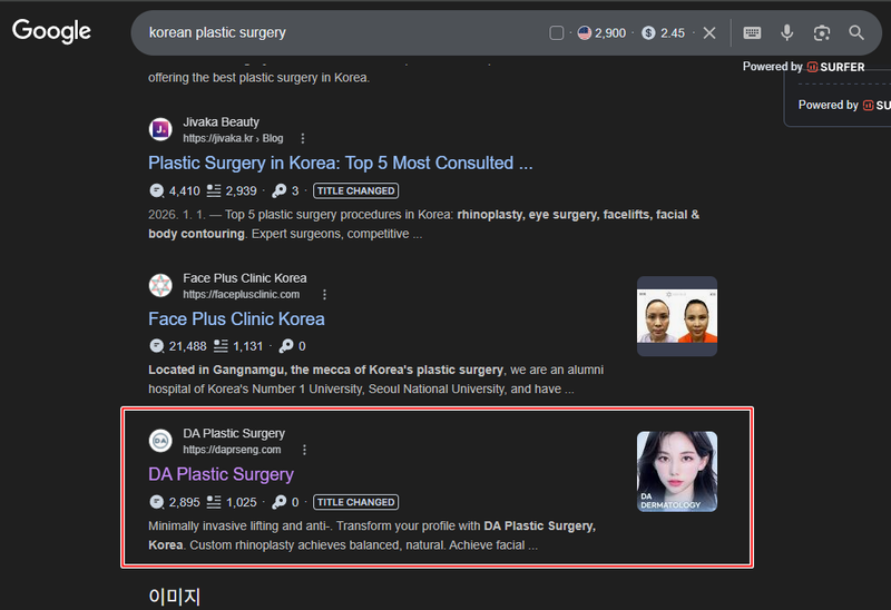 ON-PAGE SEO 컨설팅 및 백링크 작업을 위주로 "korean plastic surgery", "gangnam plastic surgery" 등 1페이지 상승 후 트렌드 유지
