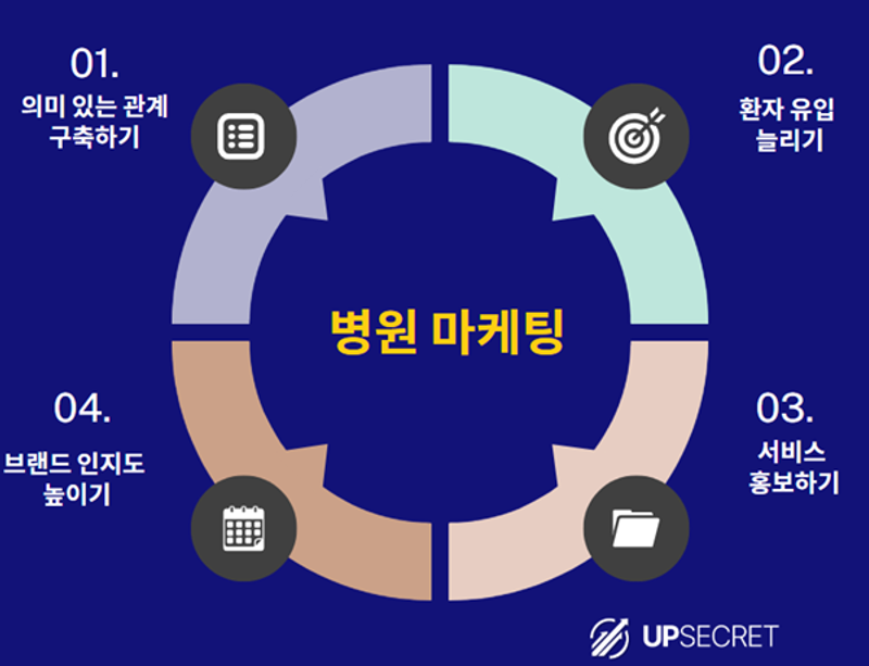 병원 마케팅은 환자와의 유대 관계를 강화하고, 재방문을 늘려 병원 운영을 효율적으로 진행하는 것이 목표입니다. 효율적인 마케팅 캠페인을 계획하고, 실행할 수 있는 원스톱 솔루션을 찾고 있다면 Upsecret SEO 를 참고해주시면 감사하겠습니다.